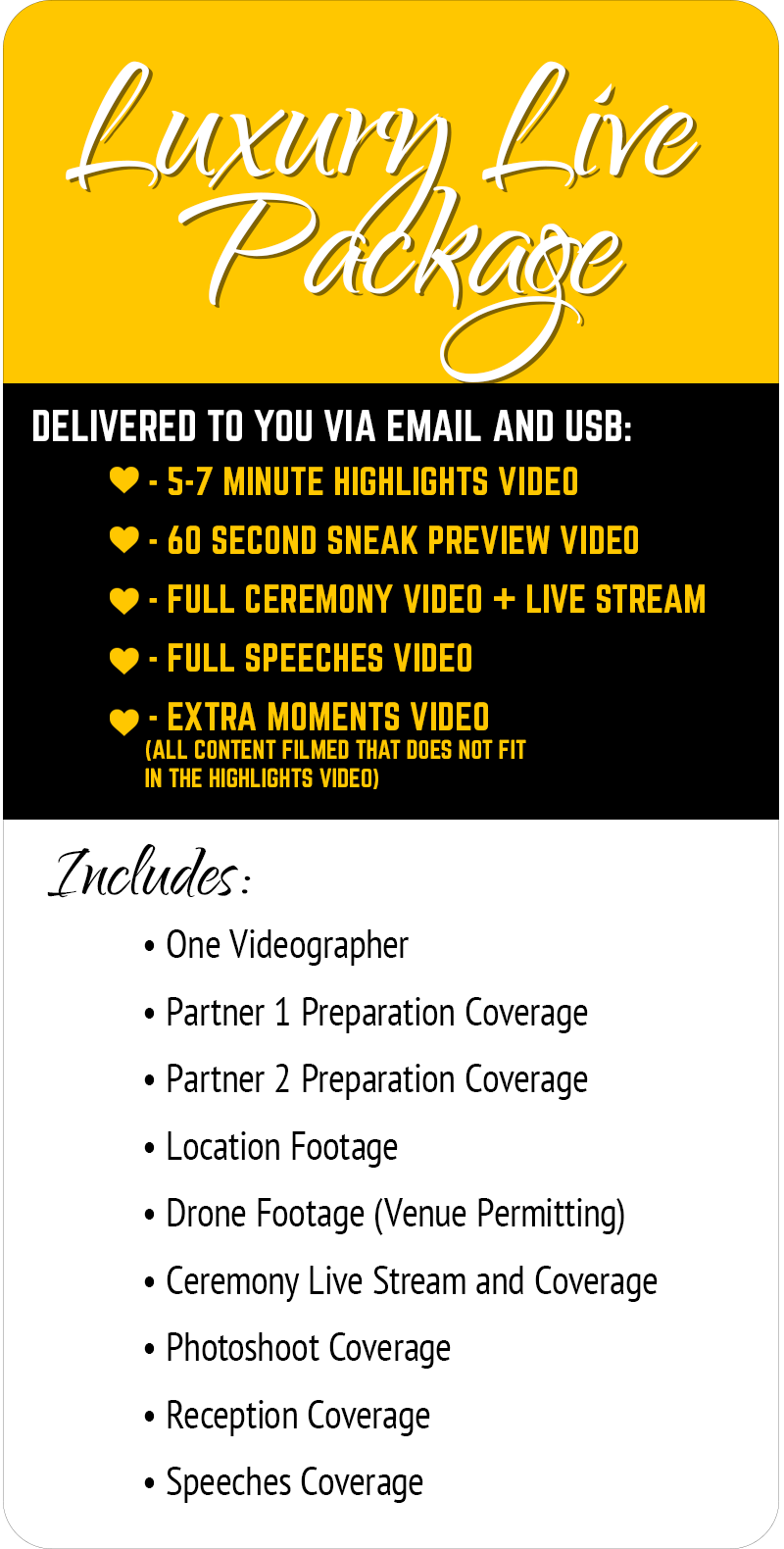 We can tailor a custom wedding videography package to capture exactly what you are looking for.